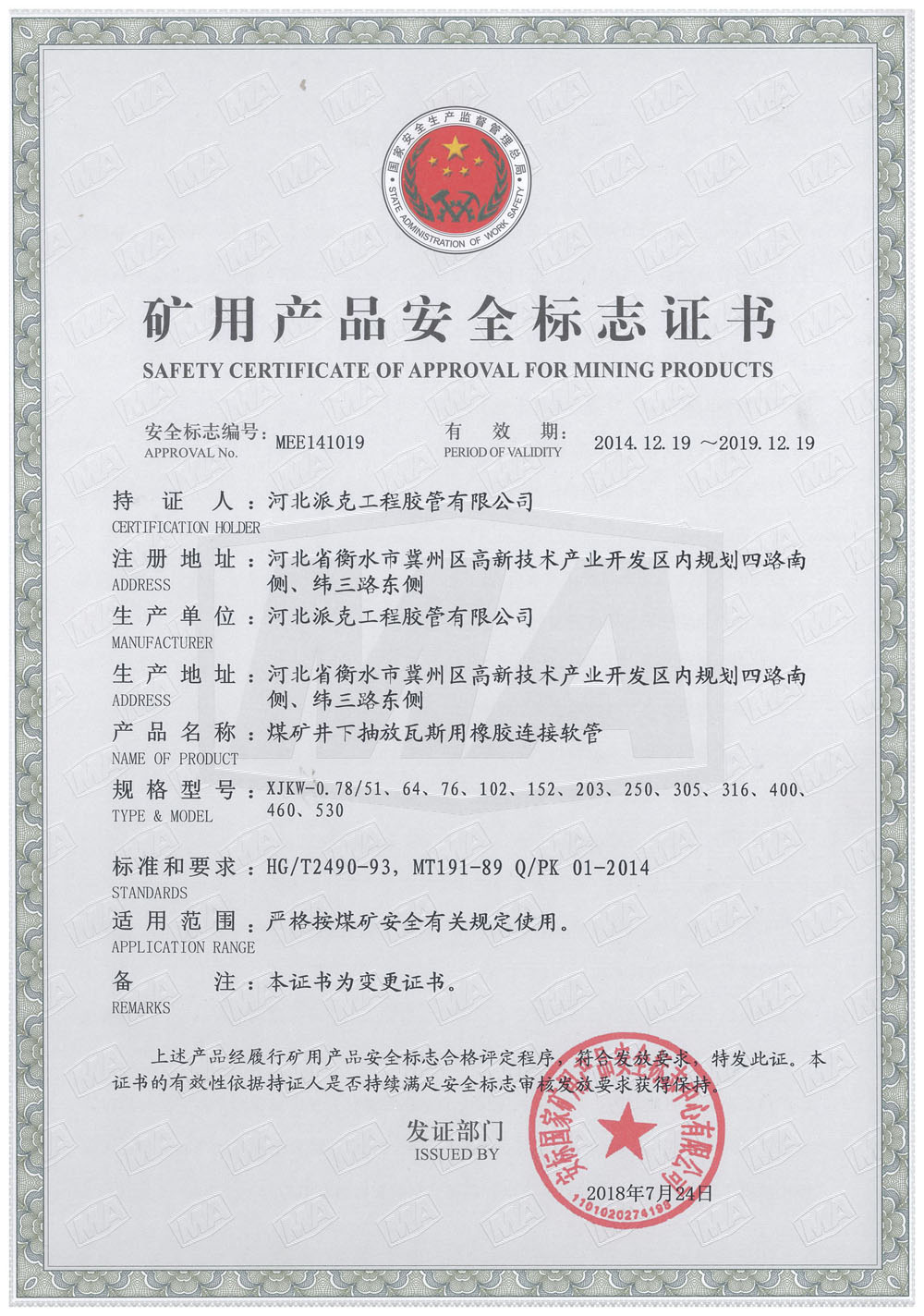 煤礦井下抽放瓦斯用橡膠連接軟管證書(shū)